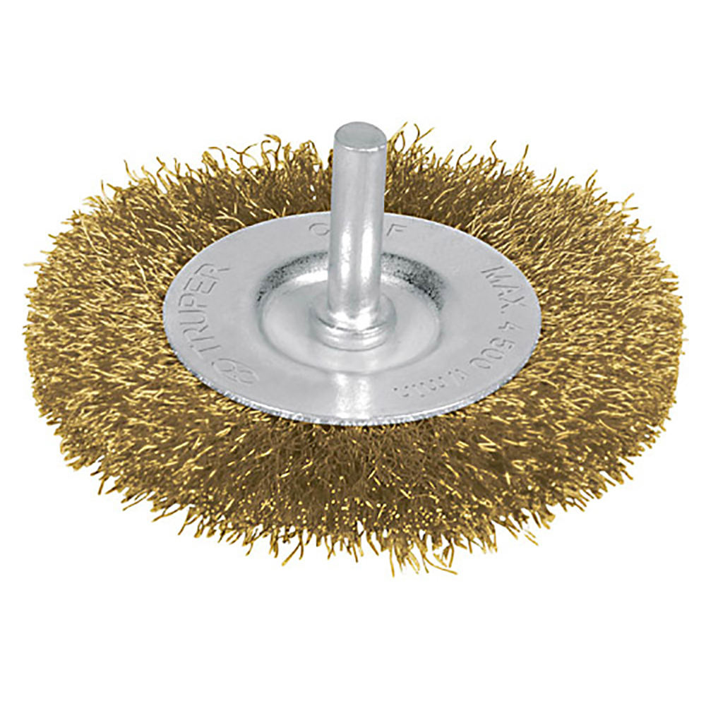 Clave Truper: CA-1-1/2F. Cepillo circular de alambre fino para taladro. Alambre ondulado de acero latonado, calibre 0,17 mm y zanco 1/4″. Cepillo desarrollado para pulir y quitar residuos de pintura.. Ø 38 mm. 5/16″. 8 mm. TRUPER. 4500 r.p.m.