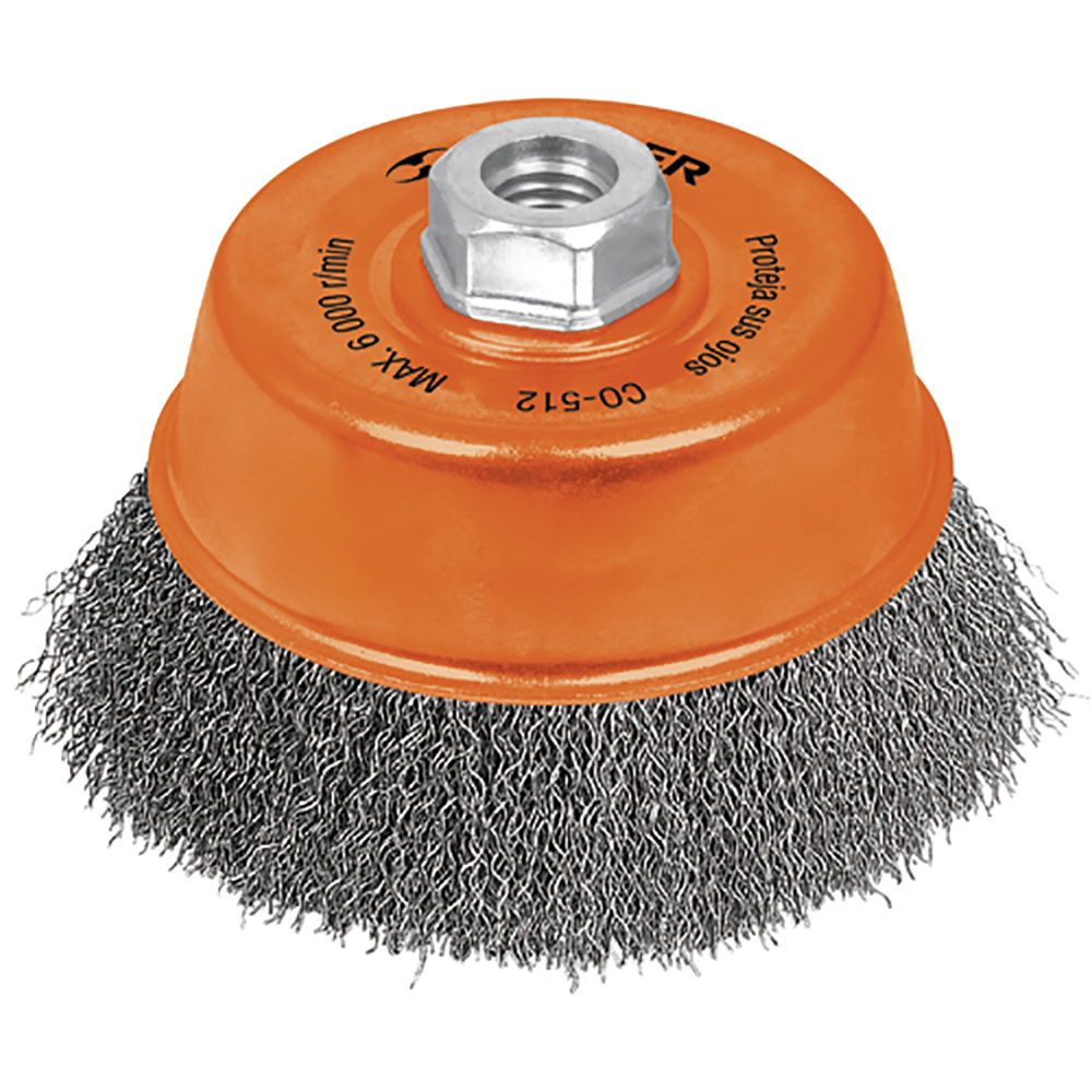 Clave Truper: CO-512M. Cepillo de copa de alambre ondulado fino para amoladora. Fabricada de acero al carbono, acabado medio, con calibre 0,3 mm y eje M14 compatible con otras marcas del mercado. Cepillo para superficies irregulares de limpieza de metales y eliminación de óxido.. Ø 125 mm. 22 mm (7/8″). 31 mm. TRUPER. 6000 r.p.m.