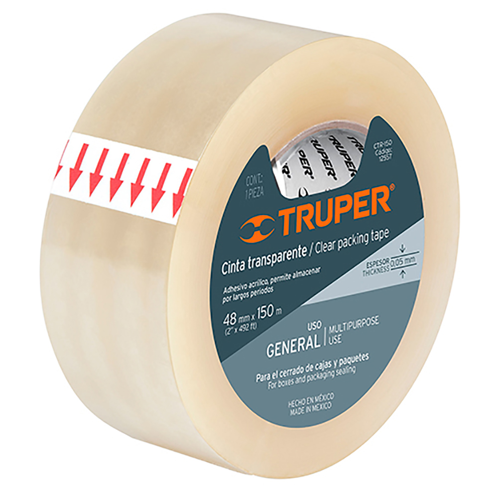 Ancho: 48 mm. Clave Truper: CTR-150. Color: Transparente. Cinta transparente de embalar fabricada con una película de polipropileno. Incorpora adhesivo acrílico base agua de adherencia media que conserva sus propiedades durante mucho tiempo. Cinta para uso general.. 0,050 mm. 150 m. TRUPER