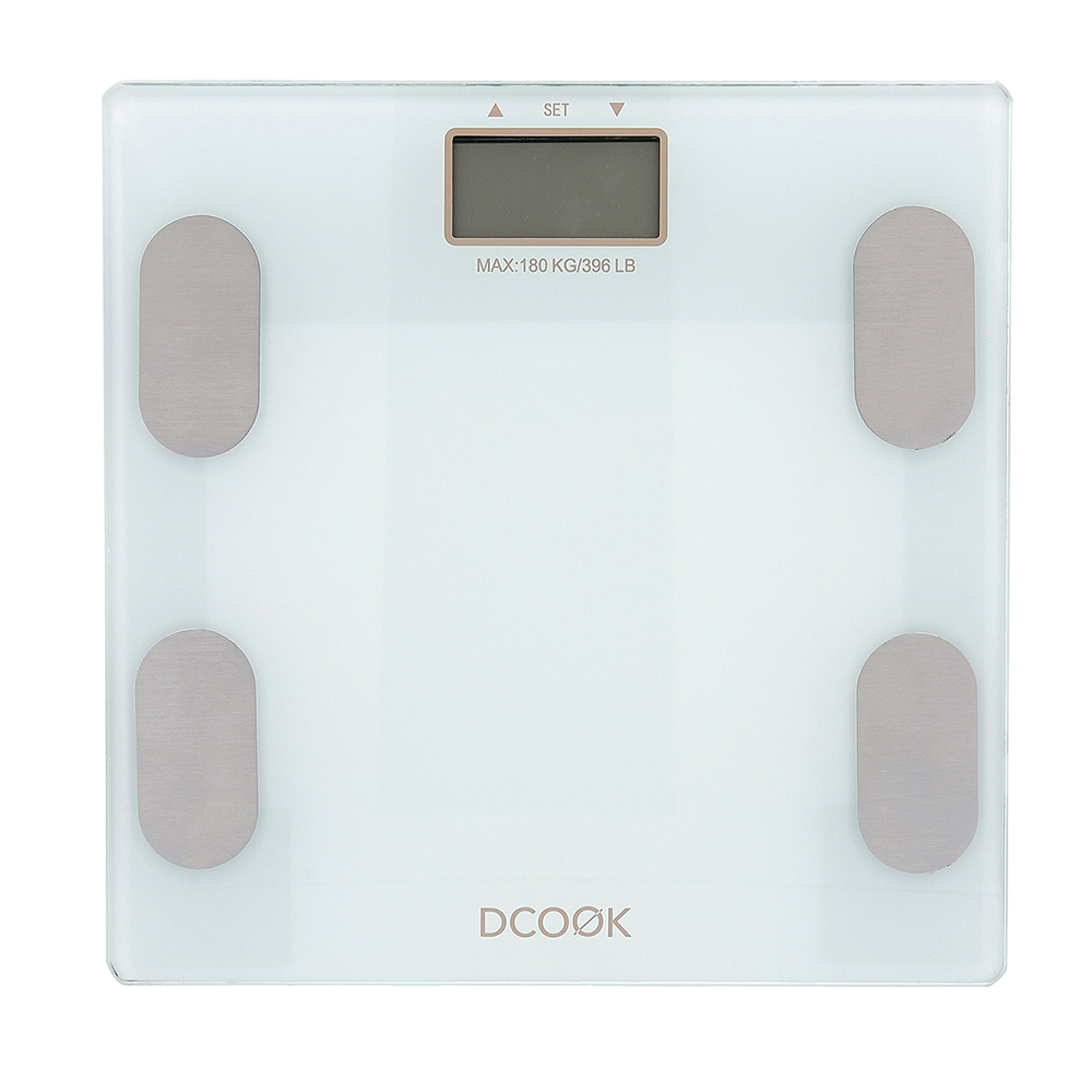Báscula de alta precisión que mide el porcentaje de grasa corporal, ideal para el cuidado personal y el seguimiento de la salud.. DCOOK