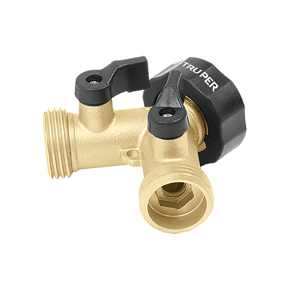 Clave Truper: AD-2X. Derivación “Y” fabricada en latón sólido, con tuerca móvil para fácil instalación y válvula de cierre independiente. Producto desarrollado para acoplar dos mangueras.. TRUPER. 3/4″ (19 mm)