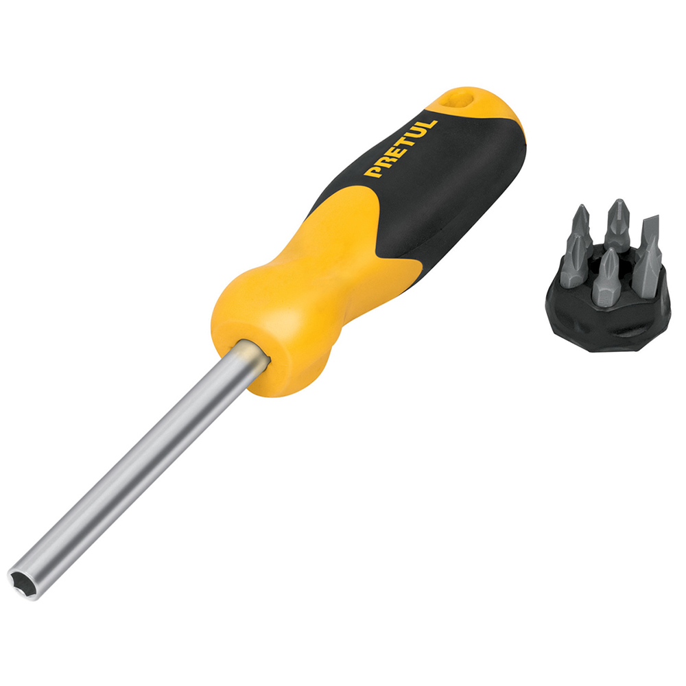 Clave Truper: DES-6P. Destornillador tipo carraca con mango ergonómico y 6 puntas de acero al cromo vanadio muy resistentes. Cuadro de mando: 6,3 mm. Incluye organizador.. 2 puntas planas (9/32″ y 3/16″), 2 puntas Phillips (PH1 y PH2), 2 puntas Pozidriv (PZ1 y PZ2).. PRETUL