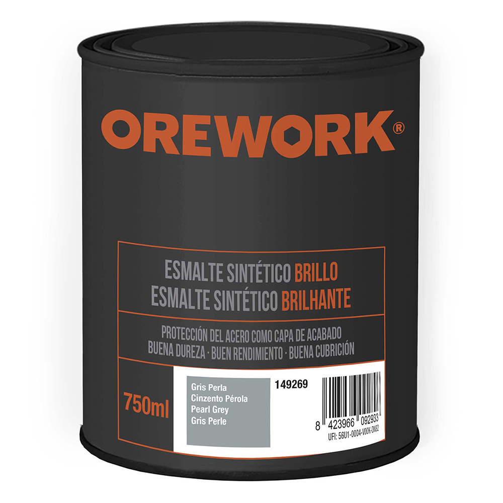 Acabado: Brillante. Capacidad: 750 ml. Color: Gris perla. Esmalte sintético Orework, de acabado brillante y color gris perla. Se caracteriza por su buena cobertura, su dureza y su buen rendimiento. Puede usarse como capa de acabado para protección del acero.. OREWORK