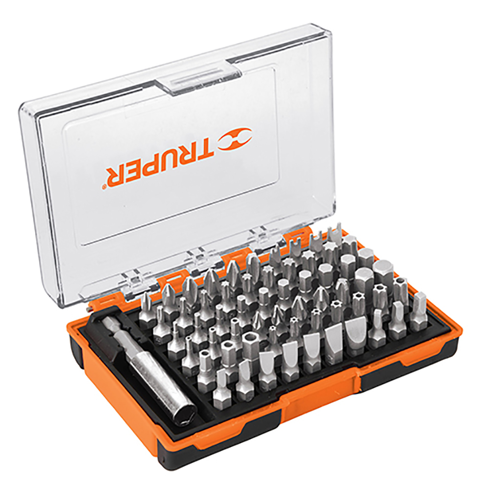 Clave Truper: PUN-61. Juego formado por 61 puntas combinadas para destornillador. Fabricadas en acero al cromo vanadio de gran resistencia. Maquinado para un ajuste preciso. Pueden usarse con taladro, destornillador eléctrico o manual. Incluye extensión magnética y estuche. Paso: 1/4″.. 7 Puntas planas, 6 Puntas de cruz, 10 Puntas Torx, 7 Puntas Torx con seguro, 5 Puntas Pozidriv, 3 Puntas cuadradas, 12 Puntas hexagonales, 6 Puntas hexagonales con seguro, 4 Puntas Spanner, 1 Extensión hexagonal magnética 60 mm.. 25 mm. TRUPER. 61 Uds.