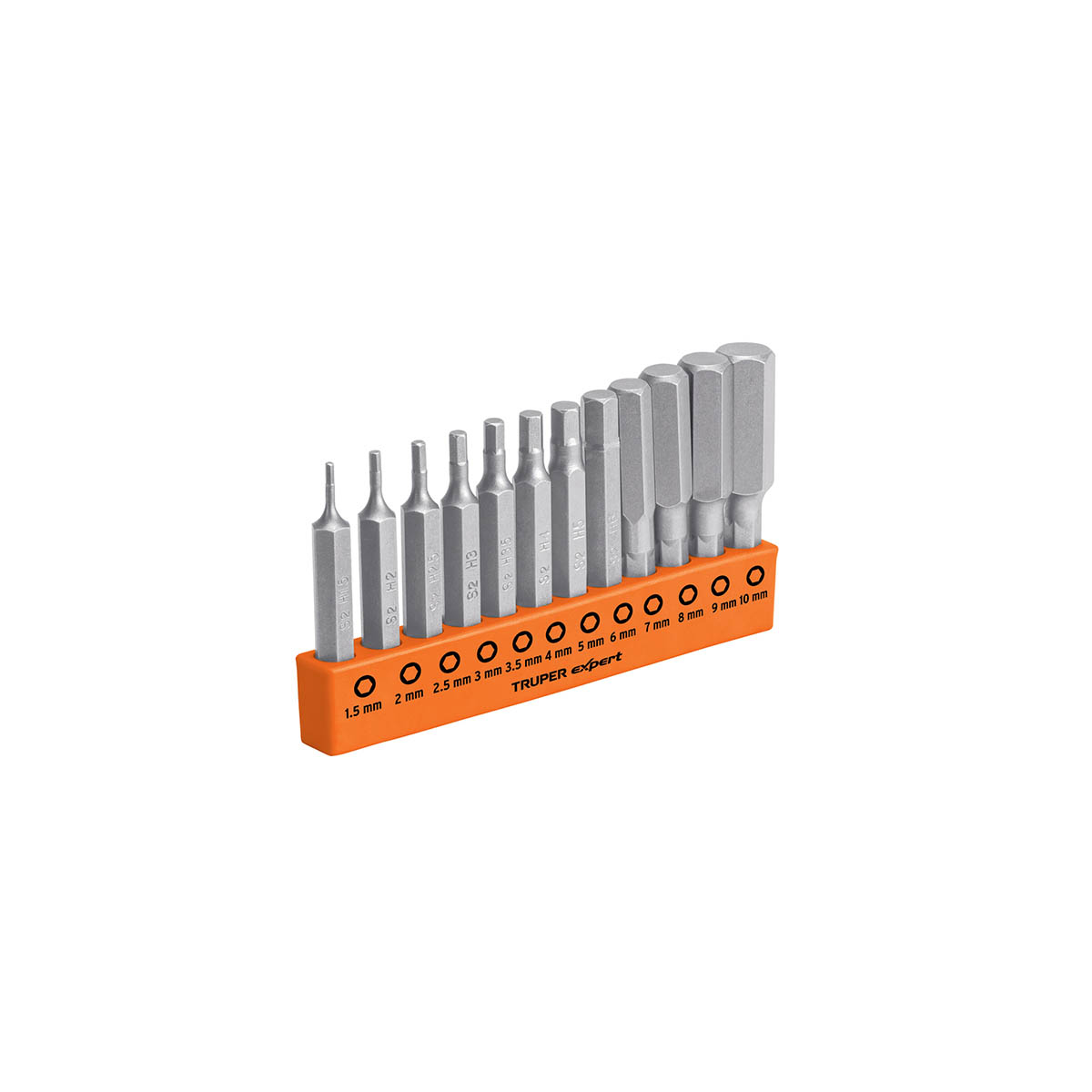Clave Truper: PUDE-12H2M. Juego de puntas hexagonales fabricadas en acero S2 muy resistente al desgaste y de gran durabilidad. Puntas indicadas para usar con taladro, destornillador eléctrico o manual. Incluye organizador de plástico.. 12 Puntas hexagonales (1.5mm, 2mm, 2.5mm, 3mm, 3.5mm, 4mm, 5mm, 6mm, 7mm, 8mm, 9mm y 10mm).. 50 mm. TRUPER EXPERT. 1/4″