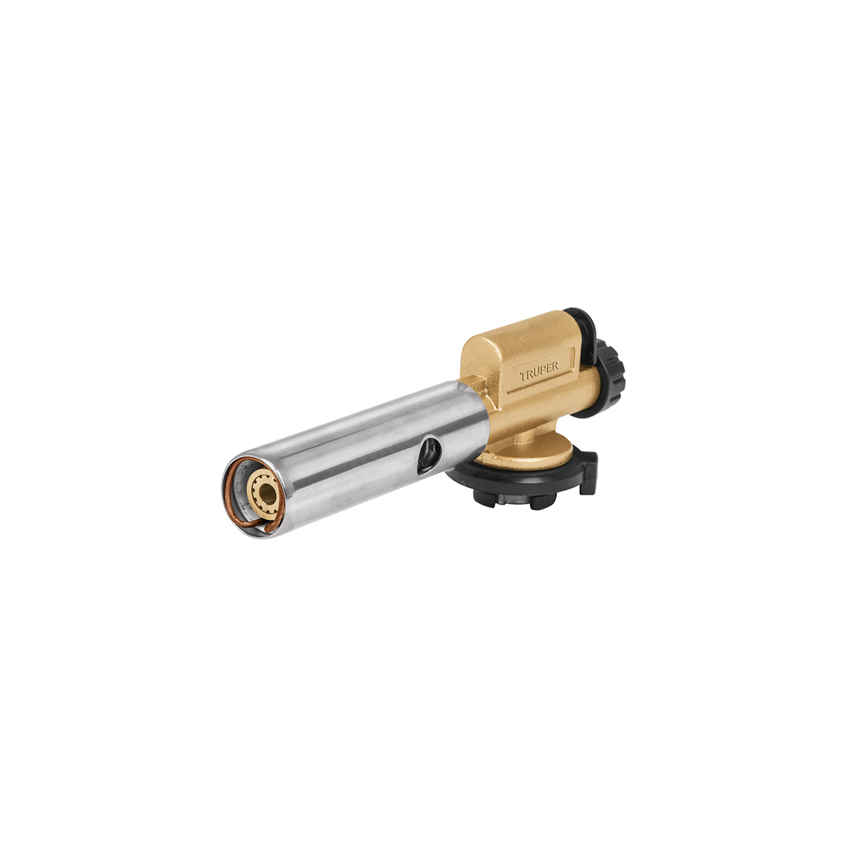 Clave Truper: BOQ-90. Compatible con:: 362126 + 255931. Soplete con boquilla ligera de acero inoxidable, cuerpo de aluminio y encendido electrónico instantáneo. Indicado para direccionar la llama y calentar más rápido el área de trabajo. *Soplete compatible con cartuchos 362126 + 255931.. 120×40 mm. TRUPER